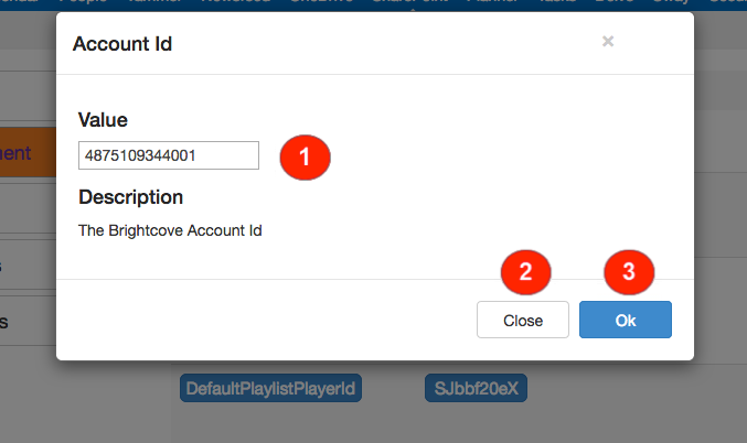 - Player ID -使用するプレイリストプレーヤーの ID を指定します。マルチアカウント環境で、プレイリストを表示するように構成されている場合、選択したプレーヤーは選択した動画と同じアカウントのものであることが重要です。プレーヤーには「選択機能」がないため、Video Cloud の ID を手動で入力する必要があります。