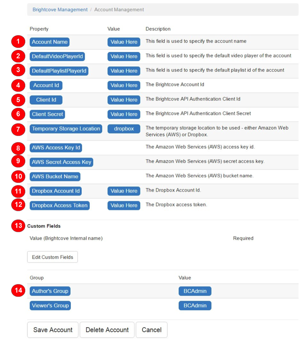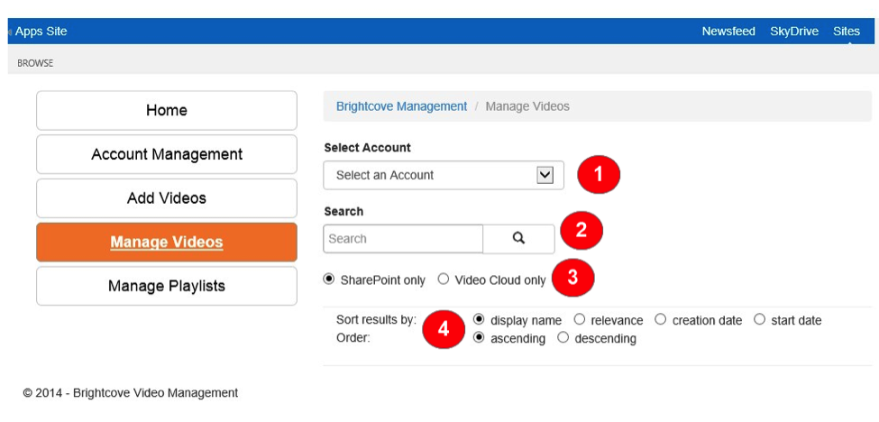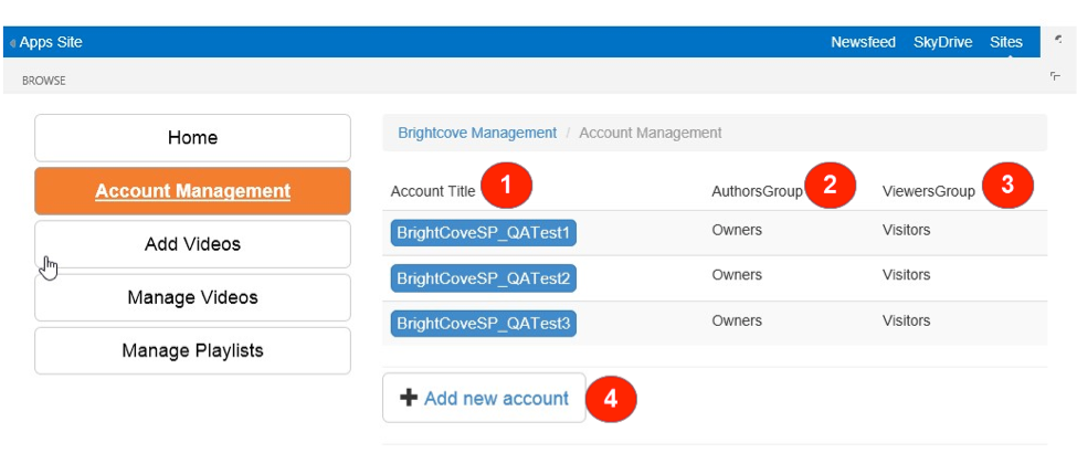 - アカウント管理 -ブライトコーブ動画クラウドアカウント情報を SharePoint に入力するためのインターフェイスを提供します。