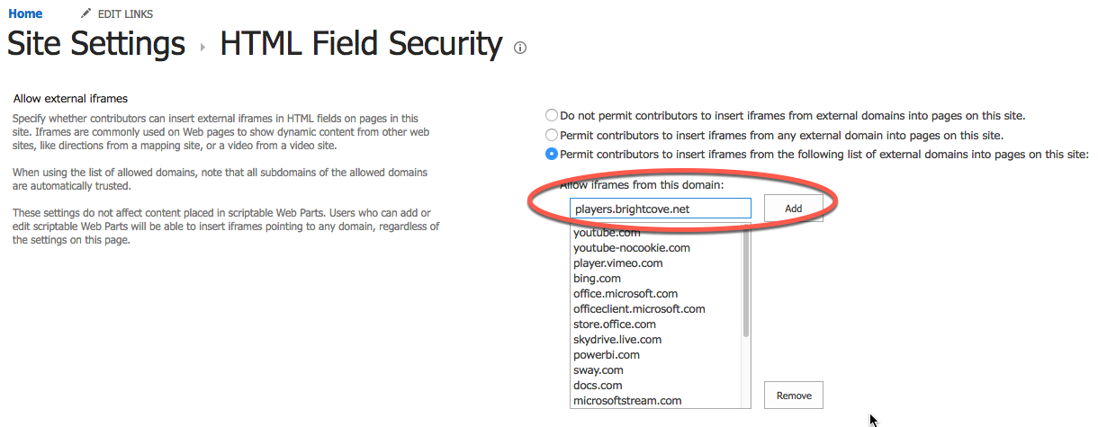 - 許可されたiframeドメインとしてplayers.brightcove.netを追加します