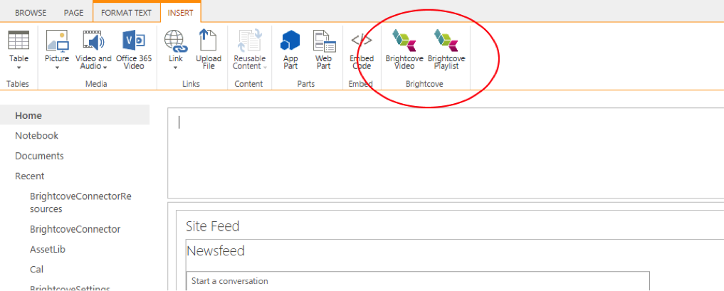 SharePoint ボタンSharePoint サイトページを編集すると、リボンに「Brightcove」アクショングループが表示されます。