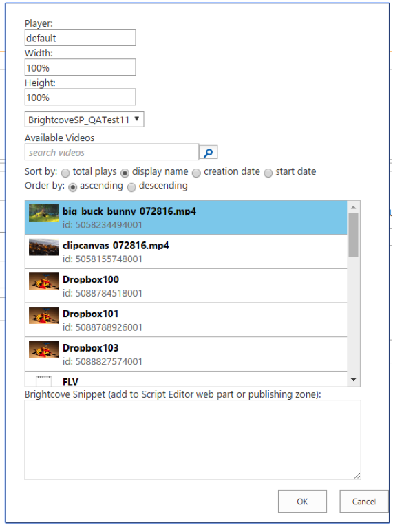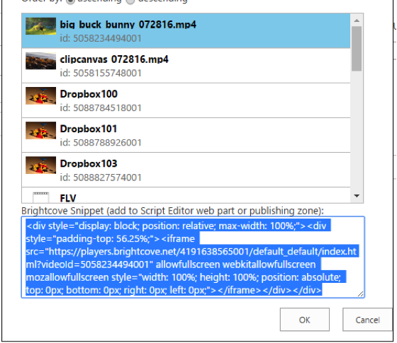 ビデオまたはプレイリストを選択すると、ユーザーは必要に応じてプレーヤー、高さ、幅を変更することができます。「OK」をクリックすると、Brightcoveプレーヤー用のスクリプトが生成され、ダイアログの下部にあるテキストエリアに配置されます。