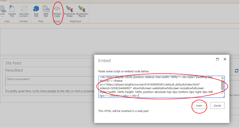Brightcove Player ソリューションパッケージでは、埋め込みコードを [埋め込みコード] ダイアログボックスにコピー/貼り付けするページに埋め込まれた Brightcove 動画用の埋め込みを生成します。このパッケージは、SharePoint Online または SharePoint オンプレミスの両方に使用できます。