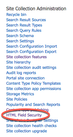 - Brightcoveアプリがインストールされているサイトコレクションのルートサイトで、[サイトの設定]に移動します->サイトコレクションの管理-> HTMLフィールドセキュリティ。
