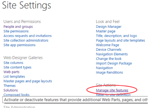 - サイト設定に移動します->サイトアクション->サイトの機能を管理します。