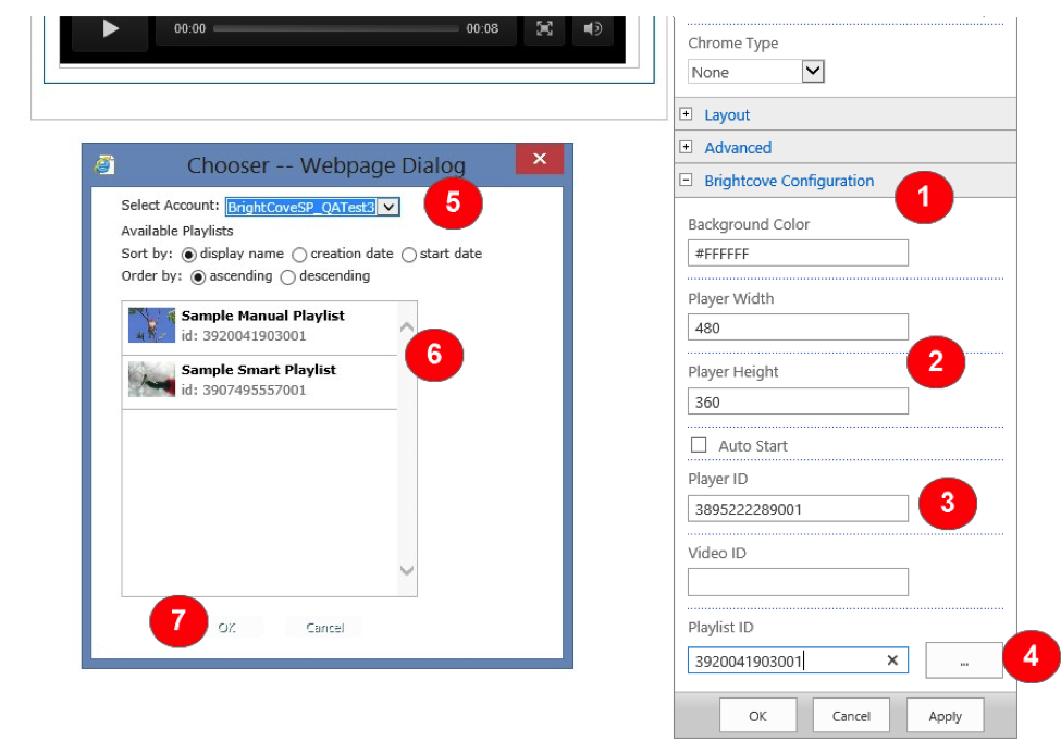 - Brightcove の設定 -Web パーツエディタのこのセクションでは、Web パーツを設定したり、再生する動画/再生リストを選択するためのパラメータにアクセスできます。