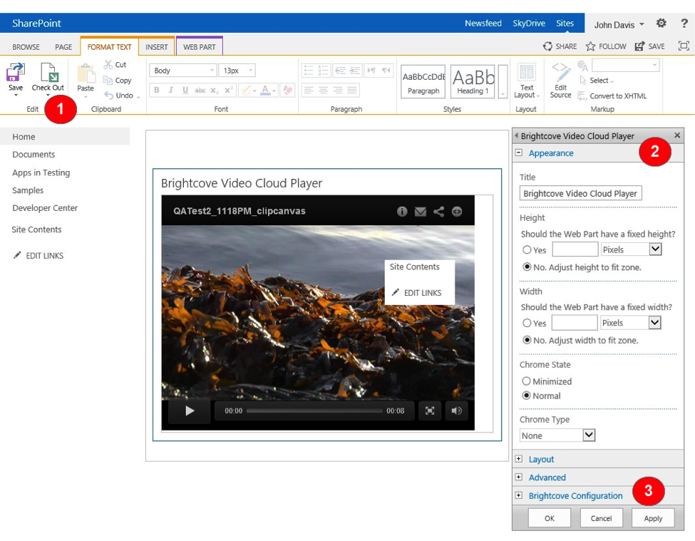 プレーヤーの Web パーツオプションを表示するには、SharePoint ページを [編集] モード (1) にする必要があります。これにより、Web パーツを編集するオプションが表示されます (2)。Web パーツ固有のオプションは、Web パーツエディタの「Brightcove の設定」セクション (3) にあります。