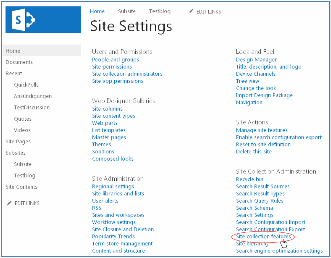 - [サイトの操作/サイトの設定-]をクリックして、機能のアクティブ化に進みます。>サイトコレクションの管理->サイトコレクション機能」: