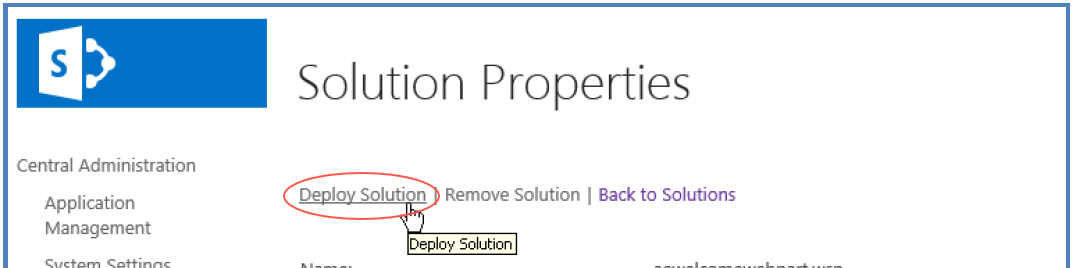 - ファームのソリューションストアに BrightCoveVideoCloudPlayer.WSP が表示されるはずです。「BrightcoveVideoCloudPlayer.wsp」をクリックしてから「DeploySolution」をクリックしてソリューションを展開します。
