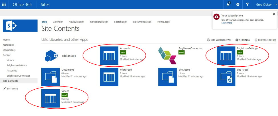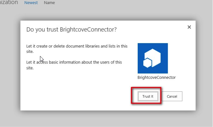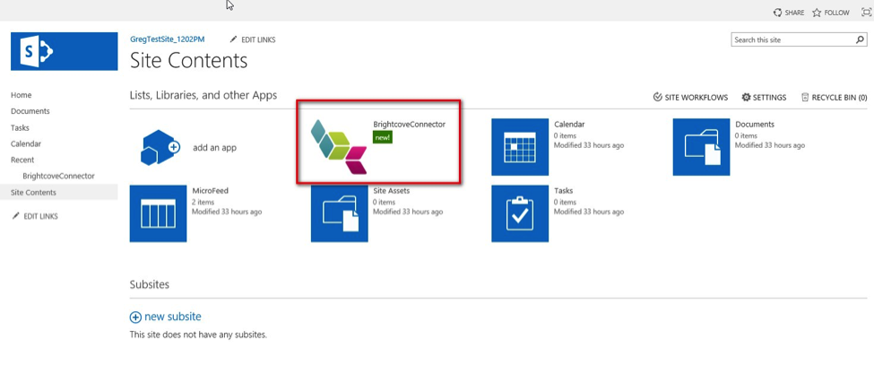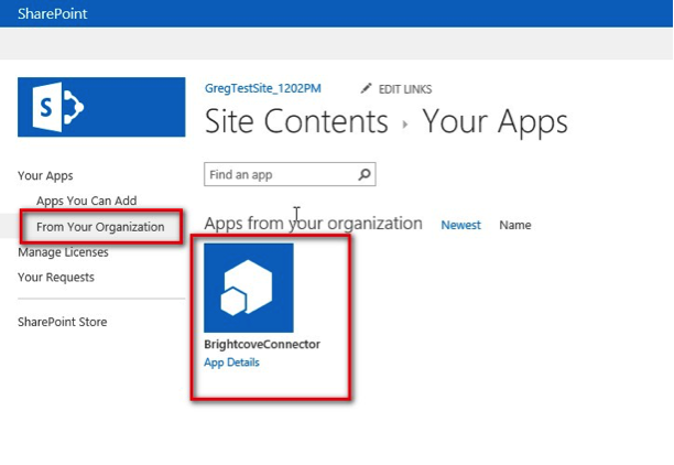 - この時点で、SharePoint 用 BrightCoveConnectorアプリケーションが追加され、サイトコンテンツリストの [アプリ] セクションに表示されます。現在、本サイトで使用可能です。