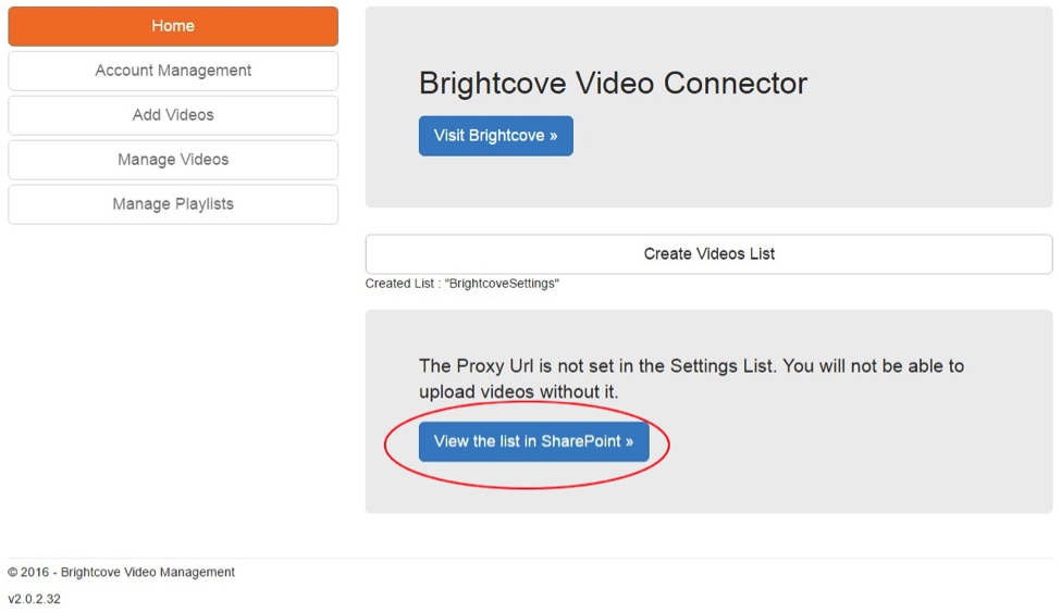 - [設定リストの作成]をクリックすると、Brightcove設定リストの作成に加えて、このリストを編集するためのプロンプトが表示され、BrightcoveAPIサポートに必要なプロキシURLが構成されていることを確認します。