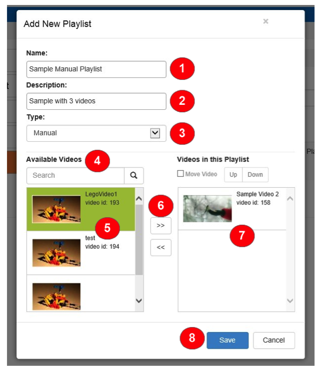 - 利用可能なビデオ -手動プレイリストの場合は、検索ボックスとアカウントで利用可能なビデオのリストを表示します。これにより、ユーザーはプレイリストに追加するビデオの選択肢を絞り込むことができます。