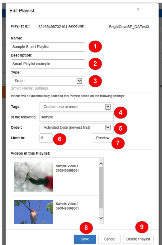 既存のプレイリストの編集は、名前をクリックするか、プレイリスト一覧の [編集] リンクをクリックして開始します。これにより、次のビューが開き、プレイリストオプションを編集できます。この例は、スマートプレイリストのオプションを示しています。[プレイリスト ID] と [アカウント] 以外のフィールドを編集する場合は、次の項目を変更できます。
