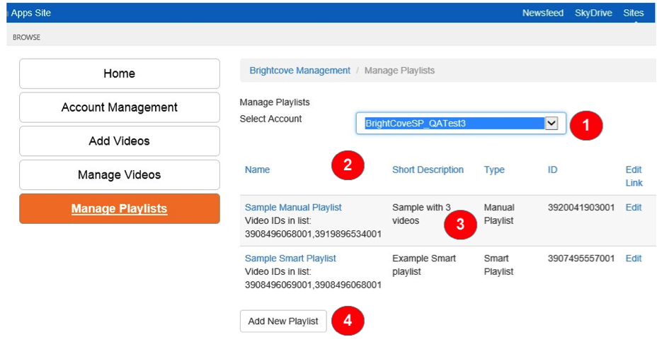 Connector の [プレイリストの管理] セクションは、新しいプレイリストの作成や、編集や更新などの既存のプレイリストの参照と管理に使用されます。動画とは異なり、プレイリスト情報は SharePoint に保存されず、このセクションでアカウントを参照するたびに Video Cloud から取得されます。このため、API を介したプレイリストデータの可用性には、以下のセクションで説明する遅延がいくつかあります。