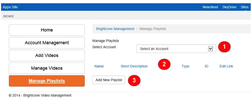 「プレイリストの管理」ランディングページには、使用可能なアカウントでプレイリストの参照や新規作成に使用できるフィールドのリストが表示されます。