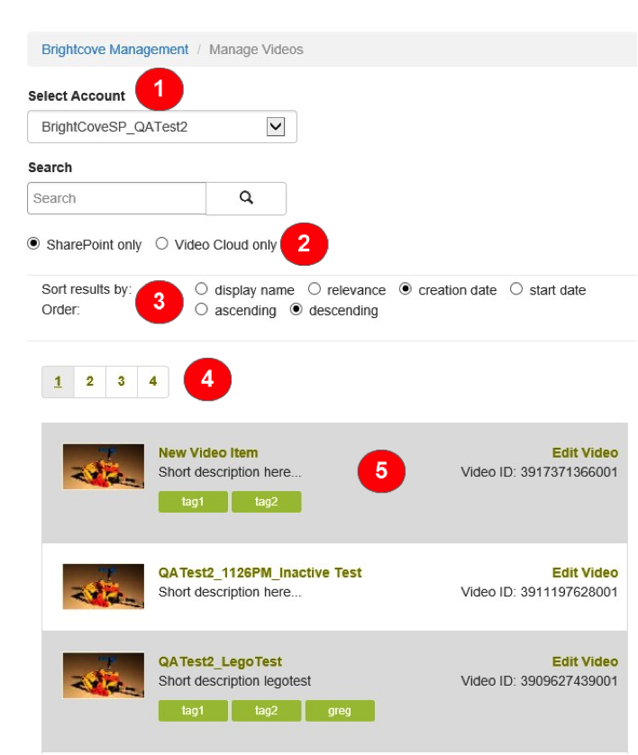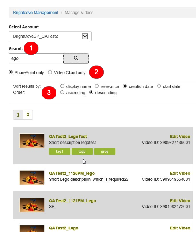 [動画の管理] で、ユーザーは検索語句を入力して、選択したアカウントで、検索語に一致する名前、説明、またはタグ情報を持つ動画を検索できます。結果リストが表示されたら、すべての並べ替えフィルタと順序フィルタを適用できます。
