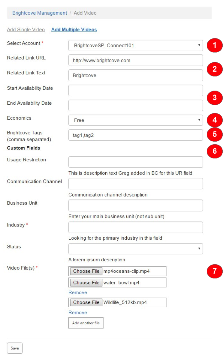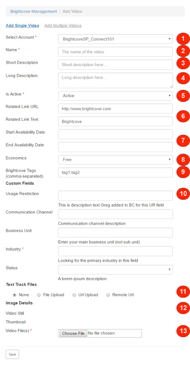 Video Cloud によって自動生成された画像を除く、他のすべての表示フィールドは、動画が初めてアップロードされたときと同様に更新できます。変更が行われたら、ユーザーは「保存」ボタンをクリックして変更をコミットします。ビデオの追加アップロードで実行されるのと同じ検証がここでも実行されます。