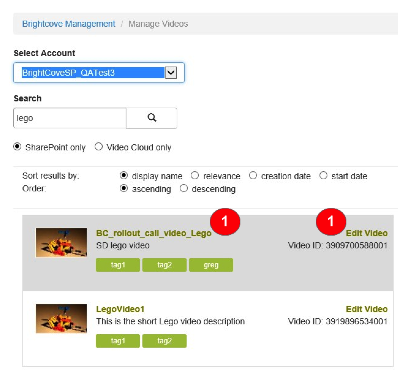 既存の動画を編集してデータフィールドを更新するには、動画一覧内の名前 (1) または [ビデオの編集] リンク (2) をクリックします。