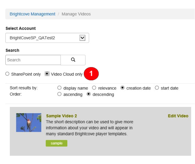 重要-SharePoint に記録されたビデオを削除しても Video Cloud 内のビデオは削除されず、ビデオを SharePoint にリンクするために使用されたタグがいくつか付いた Video Cloud に残ります。今後ビデオを SharePoint に再度インポートする場合は、「bcsp-」で始まるタグを削除する必要があります。