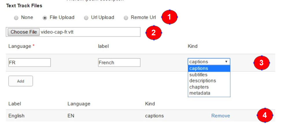 これらのオプションのいずれかを選択すると、「File Upload」アップロードは、テキストトラックファイルへの完全修飾 URL パスを入力するテキストフィールドに置き換わります。