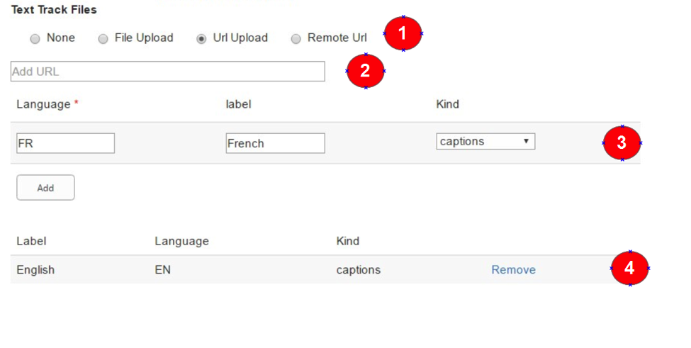 重要:1 つの動画では、ファイルアップロード、URL アップロード、リモート URL の組み合わせはサポートされません。各ビデオに関連付けることができるテキストトラックのタイプは 1 つだけです。